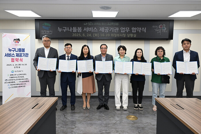 [시민일보 = 민장홍 기자] 경기 의정부시가 지난 24일 시청 상황실에서 오는 7월부터 시행하는 ‘누구나돌봄’ 사업의 원활한 추진을 위해 7개 서비스 제공기관과 업무협약을 체결했다.