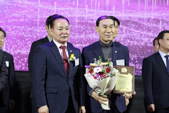 | ▲ 고선재 의장(오른쪽)이 대한민국 시군자치구의회의장협의회 정기총회에서 ‘대한민국지방의정봉사대상’을 수상했다. (사진=서초구의회 제공) |