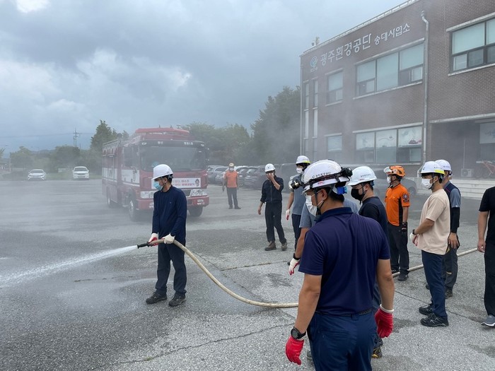 [광주=정찬남 기자] 광주환경공단(이사장 직무대행 박재우)이 16일 광산구 본덕동에 위치한 광주제2하수처리장에서 평동119안전센터와 합동 소방훈련을 실시했다.