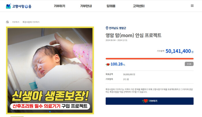 영암 맘 안심프로젝트는 2027년 개원할 영암군 공공산후조리원의 의료기기 구입비를 마련하기 위한 기부로, 올해 6~12월을 기간으로 지정했는데 모금 171일만에 5010만원의 성과를 올렸다.