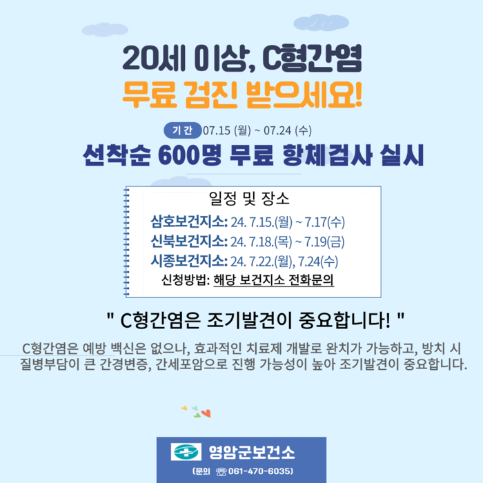 영암군보건소 관계자는 “영암군민의 건강과 지역사회의 위생에 심각한 영향을 미칠 수 있는 C형간염을 예방하도록 무료 항체검사에 많은 관심과 참여 바란다”고 전했다.