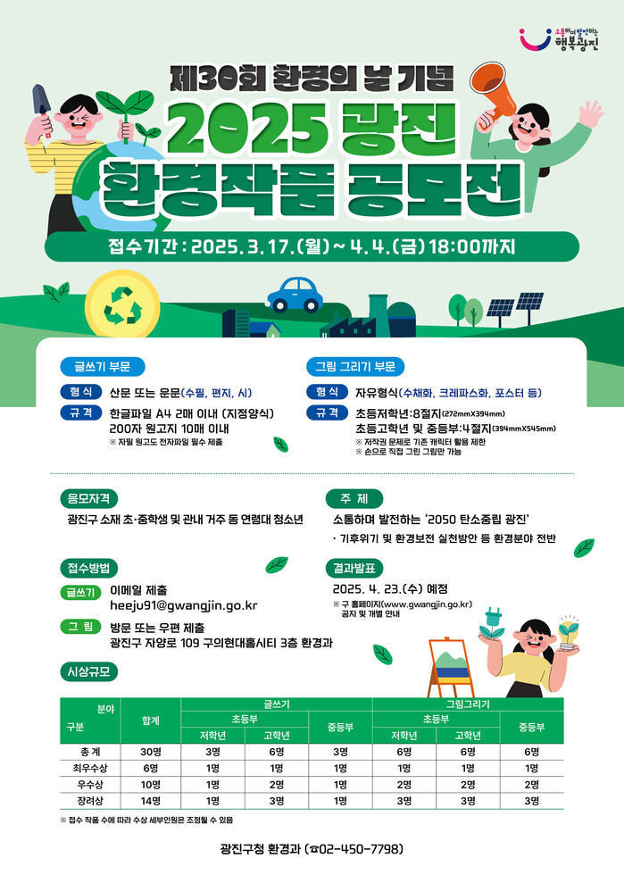 [시민일보 = 여영준 기자] 서울 광진구(구청장 김경호)가 환경을 주제로 우수 문예작품을 가리는 ‘2025년 광진 환경작품 공모전’을 오는 4월4일까지 개최한다.