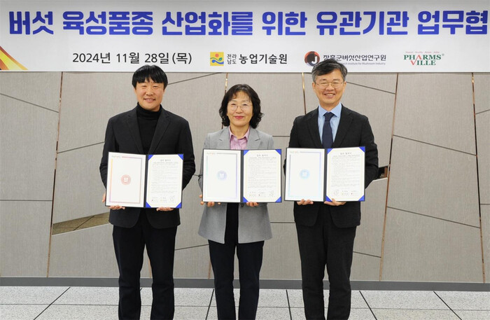이날 협약식에는 김행란 전라남도농업기술원장, 김경제 (재)장흥군버섯산업연구원장 직무대리, 이병욱 ㈜팜스빌 대표 등이 참석했다.
