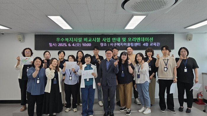 | ▲ 우수복지시설 비교시찰 사업 안내 및 오리엔테이션에 참석한 관계자들이 기념촬영을 하고 있다. (사진=인천 서구청 제공) |