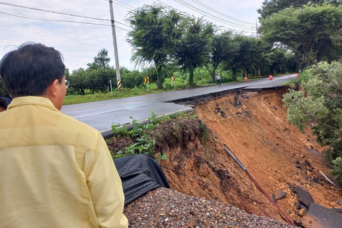 | ▲ 부덕동~세지방향 국도 23호선 도로 유실 현장을 점검하는 윤병태 나주시장(출처=나주시) |