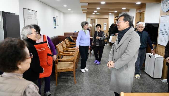 경기 수원시 영통구가 구민과의 소통을 위한 적극적인 현장 행정을 이어가고 있다. 지난 17일 박사승 영통구청장은 해빙기 안전사고 예방을 위해 매탄3동 하늘채경로당을 방문해 해빙기 기온변화에 따른 경로당 위험 요소 등을 직접 점검했다. 사진은 박 구청장(오른쪽)이 노인들과 이야기를 나누고 있는 모습. (사진=영통구청 제공)