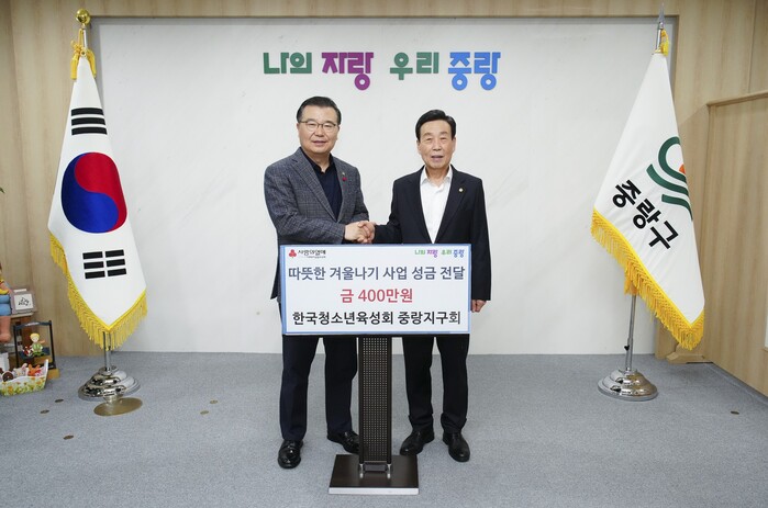 중랑구에 이웃들의 따뜻한 겨울나기를 돕는 온정의 손길이 계속해서 이어지고 있다. 사진은 최근 전달식에서 류경기 구청장(왼쪽)이 한국청소년육성회 중랑구지회로부터 성금 400만원을 전달받은 후 기념 촬영을 하고 있는 모습. (사진=중랑구청 제공)