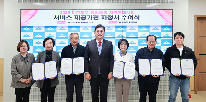 [인천=문찬식 기자] 인천 미추홀구(구청장 이영훈)는 3일 구청장실에서 ‘2026년 미추홀구 통합 돌봄 지역특화 사업을 수행할 서비스 제공기관 5곳에 지정서를 수여했다고 밝혔다.