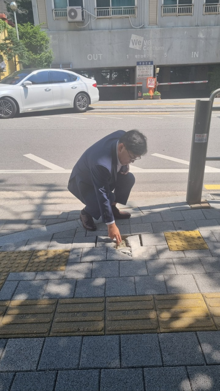 | ▲ 제갑섭 강동구의원이 동신중학교 정문 앞 보도블록 파손 현장을 살펴보고 있다. |