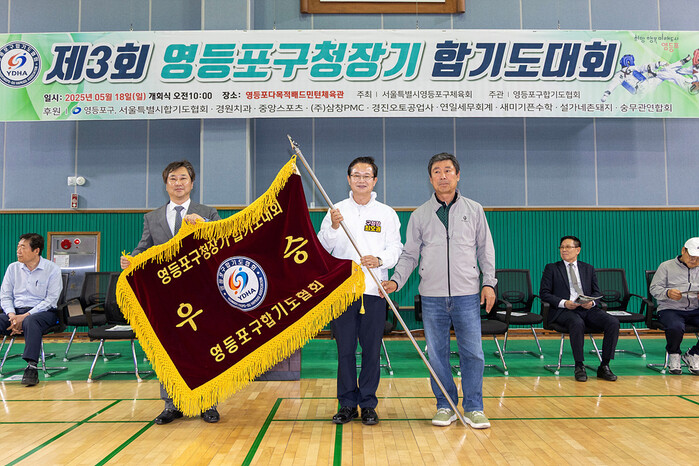 영등포구가 18일 다목적배드민턴체육관에서 제3회 영등포구청장배 합기도 대회를 진행했다. 사진은 대회에 참석한 최호권 구청장(가운데)이 우승기를 들고 기념촬영을 하고 있는 모습.(사진=영등포구청 제공)