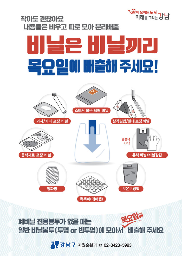 아울러, 이번 사업으로 폐비닐 분리배출 품목이 확대되고 폐비닐 반입이 증가할 것으로 예상되면서 강남환경자원센터와 협력해 폐비닐 선별 작업을 더 정교화할 계획이다. 라면스프, 믹스커피, 약봉지 등의 작은 비닐 뿐만 아니라 스티커 붙은 비닐, 유색 비닐, 양파망, 이물질을 제거한 비닐, 뽁뽁이, 물을 사용하는 보온보냉팩 등은 모두 재활용할 수 있다. 다만, 음식물 등으로 심하게 오염된 폐비닐은 물로 헹구는 등 이물질을 제거한 뒤 분리 배출해야 하며, 랩·노끈 등은 재활용할 수 없다.