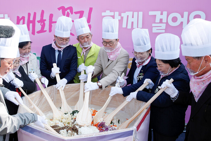 성동구 용답동 주민자치회가 최근 용답동 매화거리에서 "용답 매화꽃길, 함께 걸어요" 행사를 개최했다. 사진은 행사에 참석한 정원오 구청장(오른쪽 네 번째)이 참여자들과 매실고추장 비빔밥을 만들고 있는 모습. (사진=성동구청 제공)