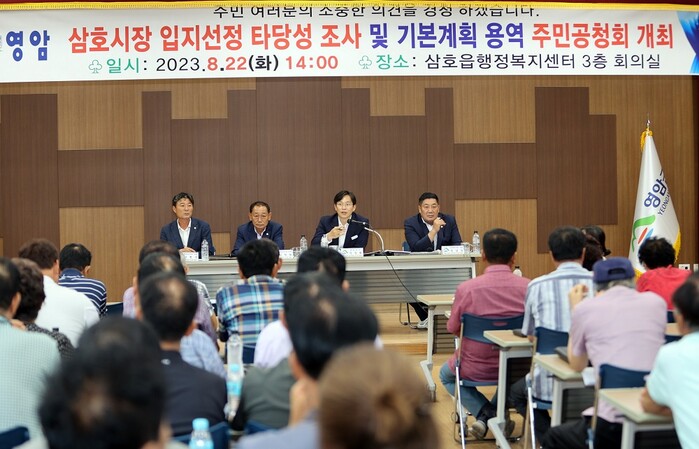[영암=정찬남 기자] 전남 영암군(군수 우승희)이 지난 22일, ‘삼호시장 입지선정 타당성 조사 및 기본계획 수립 용역 주민공청회’를 삼호읍행정복지센터에서 개최했다.