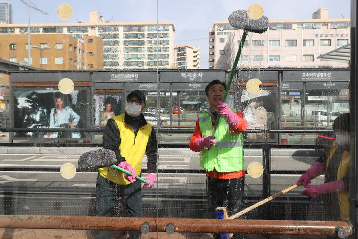 전성수 서초구청장이 26일 서울 서초구 고속터미널역 일대에서 새봄맞이 대청소를 하고 있다.