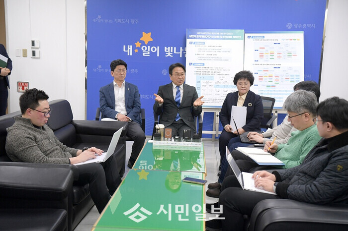 | ▲ 강기정 광주광역시장이 24일 시청 기자실에서 기자들을 만나 도시철도 2호선 개통에 대비한 역대 최대규모 신규 인력 채용계획을 설명하고 있다. /광주광역시 제공 |