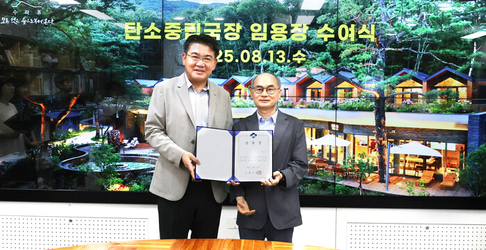 오승록 노원구청장이 최근 구청장실에서 탄소중립국 국장, 탄소중립도시 과장에 임용장을 수여했다. 이번 인사는 서울시 자치구 최초로 ‘탄소중립국(局)’을 신설해 기후위기대응을 위한 컨트롤 타워를 마련하고 수도권 유일 ‘탄소중립 선도 도시’ 선정에 걸맞은 행정 전반의 강력한 실행력을 확보하기 위해 추진됐다. 사진은 오 구청장(왼쪽)이 기념 촬영을 하는 모습. (사진=노원구청 제공)