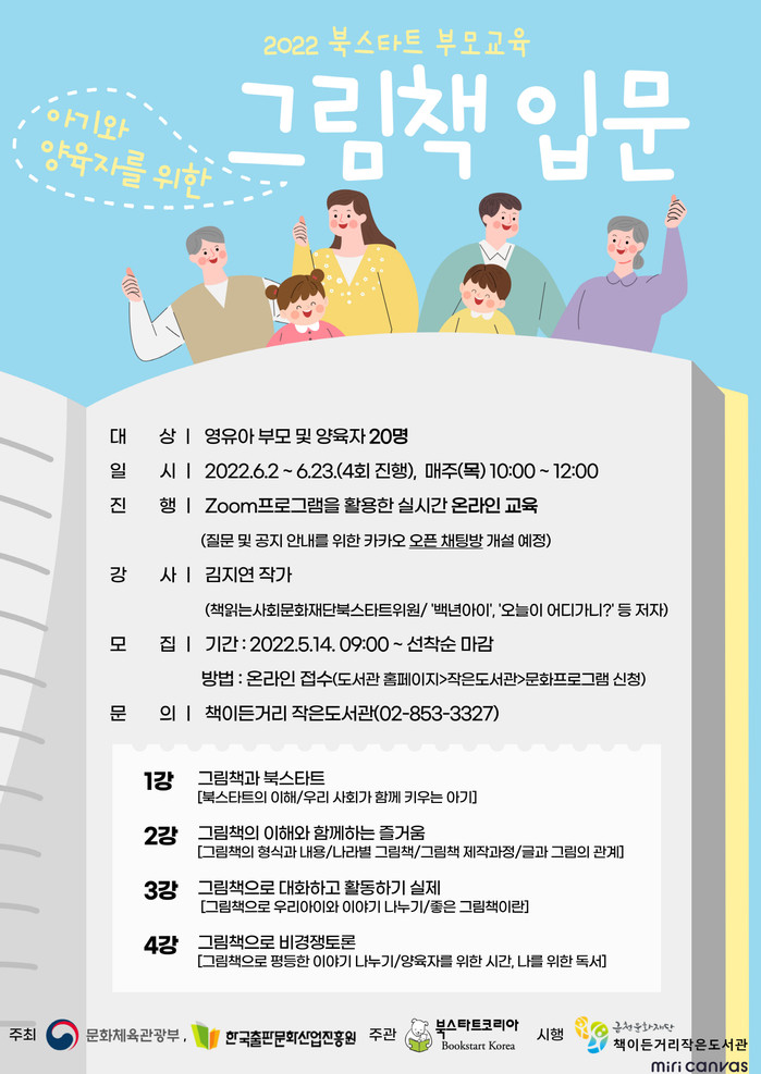 강좌는 매주 목요일 오전 10시~낮 12시 2시간 동안 줌(zoom)을 활용한 온라인 교육으로 진행된다. 프로그램은 ▲그림책과 북스타트 ▲그림책의 이해와 함께하는 즐거움 ▲그림책으로 대화하고 활동하기 실제 ▲그림책으로 비경쟁 토론 총 4강으로 마련됐다.