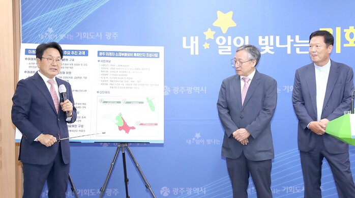 | ▲ 강기정 광주광역시장이 지난해 7월 20일 오후 시청 5층 브리핑룸에서 ‘미래차 소재 부품 장비 특화단지 선정’ 관련 기자회견을 하고 있다./광주광역시 제공 |