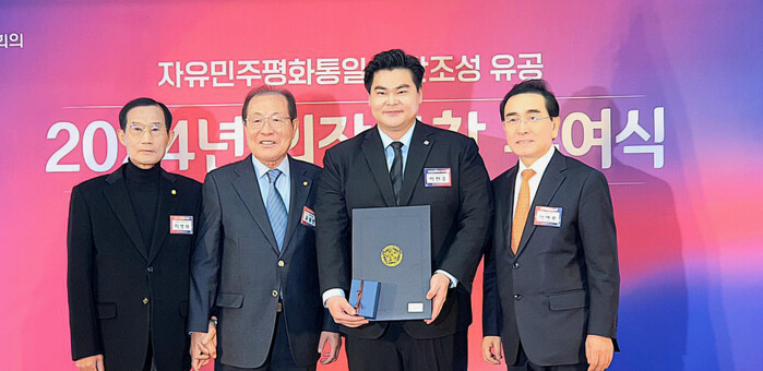 [시민일보 = 여영준 기자] 박현우 서울 영등포구의회 의원이 최근 서울 중구 소재 민주평화통일자문회의 사무처 2층 대회의실에서 열린 자유민주평화통일 기반조성 유공자 대상 ‘2024년 의장표창 수여식’에서 의장(대통령) 표창을 받았다.