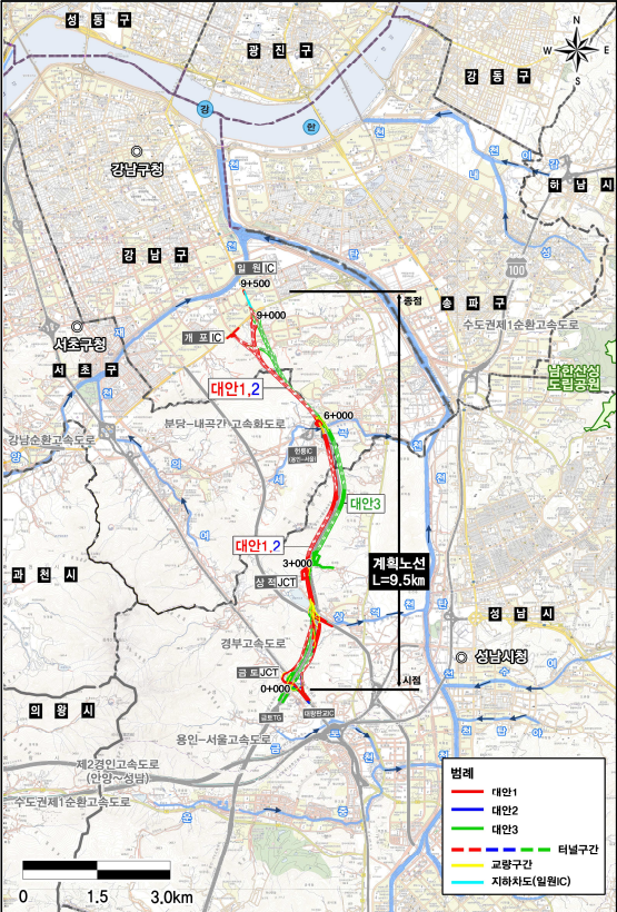 한편 2016년도에 민간투자사업으로 제안된 성남~강남 민자고속도로는 성남 금토동에서 강남 개포동과 일원동으로 이어지는 길이 9.5km 구간, 차폭 3.25m의 소형차 전용 고속도로로 계획됐다.