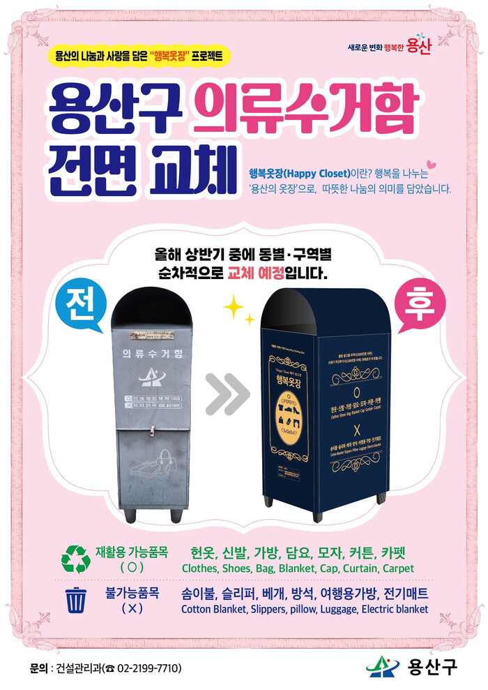 이번 사업은 의류 수거함 관리단체의 제안으로 추진된 사업으로, 기존의 의류 수거함을 폐기하고 재활용 효율을 높고 체계적인 관리가 가능한 '행복옷장'이라는 이름에 새로운 의료수거함으로 새롭게 설치하는 것이다.
