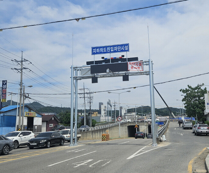 지하차도 진입차단시설은 지하차도에 폐쇄회로(CC)TV, 차단기, 전광판, 수위계 등을 설치해 수위가 일정 수준(15cm)에 도달하면 센서를 통해 자동으로 경보음이 울리고 차단막이 내려와 지하차도 진입을 막는 시설이다.