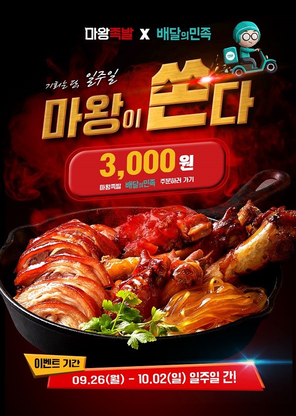 9월 26일부터 10월 2일까지 일주일간 진행되는 이번 프로모션은 한 아이디 당 횟수 제한 없이 전 메뉴 주문 시 3,000원이 할인되는 쿠폰을 제공하며, 해당 쿠폰은 3만 원 이상 주문 시에만 사용할 수 있다.행사 기간 동안 배달의민족 앱 내 마왕족발 브랜드관 페이지 또는 매장을 검색하여 할인쿠폰을 다운로드해 결제 시 적용하면 3천 원 할인된 금액으로 주문 가능하다. 이번 배달의민족 프로모션은 마왕족발 전 지점에서 진행되며, 자세한 매장 정보는 배달의민족 앱을 통해 확인할 수 있다.