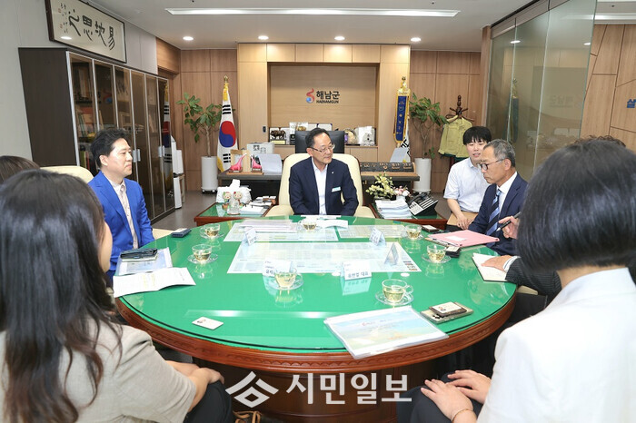 | ▲ 명현관 해남군수(사진 가운데)가 지난 23일 군수실에서 일본 게이오 백화점 관계자와 군 직영 쇼핑몰인‘해남미소’와 연계한 일본 온라인 시장 진출을 위한 논의를 하고 있다. / 해남군 제공 |