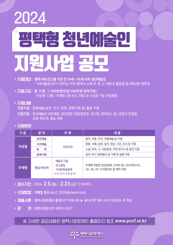 [평택=오왕석 기자] (재)평택시문화재단은 '2024 평택형 청년예술인 지원사업' 공모 접수를 2월 5일부터 23일까지 진행한다. 지원대상은 평택시에 연고가 있는 만 19세 이상 39세 이하의 청년 예술인이다.