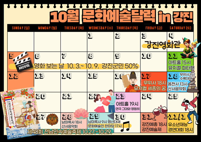 가장 먼저 오는 10월3일 개천절부터 추석 연휴, 10월9일 한글날까지 7일 간 연속 운영되는 ‘강진영화관 영화보는날’이 진행된다. ‘영화보는날’은 강진군민 대상 전 회차 50% 할인 상영으로, 가족, 연인, 친구와 함께 문화생활을 즐기며 가을 연휴를 보내기에 안성맞춤이다.
