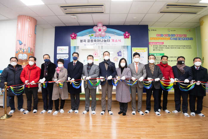경북 구미시가 23일 구미시 공동육아나눔터 5호점 ‘봉곡공동육아나눔터 개소식’을 열었다. 봉곡공동육아나눔터는 봉곡도서관 어린이열람실내 107㎡ 규모로 프로그램실·사무실 등을 갖춘 시설로 리모델링했다. 사진은 개소식에서 장세용 시장(가운데)이 관계자들과 테이프 커팅을 하는 모습. (사진제공=구미시청)