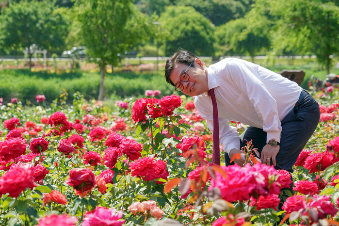 | ▲ 이필형 구청장이 중랑천 장미정원을 찾아 장미를 살펴보고 있다.(사진=동대문구청 제공) |