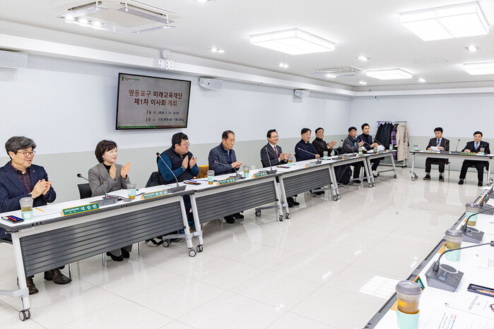 21일 영등포구청 기획상황실에서 2026년 영등포구미래교육재단 제1차 이사회가 진행됐다. 사진은 이날 이사회에 참석한 최호권 구청장(왼쪽 다섯 번째)과 참석자들의 모습. (사진=영등포구청 제공)
