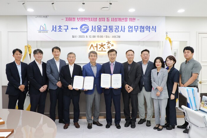 [시민일보 = 이대우 기자] 서울 서초구(구청장 전성수)가 지난 12일 구청에서 서울교통공사와 지하철 보행편의시설 설치 등 시설개선을 위한 업무협약을 체결했다.