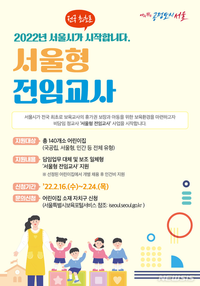 ‘서울형 전임교사’는 평상시에는 보조교사로 어린이집에 상주하다가 보육교사가 유급휴가 중일 때만 담임교사로 활동하는 정규인력으로, 올해 서울시에서 전국 최초로 시행하는 시범사업이다.