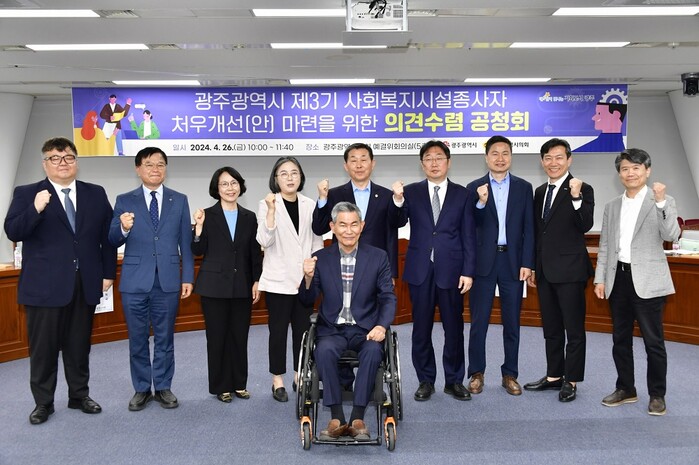 [광주=정찬남 기자] 광주광역시(시장 강기정)는 26일 광주시의회 예산결산위원회 회의실에서 사회복지시설 관계자 등 100여 명이 참석한 가운데 ‘제3기 사회복지시설 종사자 처우개선 종합계획 수립 의견수렴을 위한 공청회’를 개최했다.