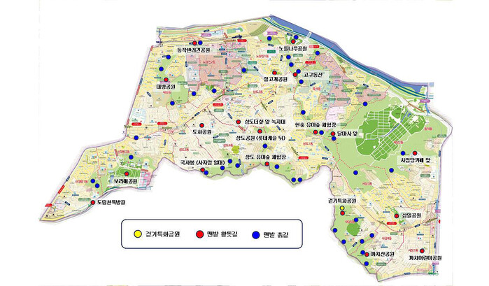 또한 구는 오는 5월까지 맨발 흙길 40곳도 조성한다. 구는 산림 등 자연 발생적으로 생겨난 흙길의 장점을 살려 노면을 정비하고 맨발 흙길에 벤치, 안내판 등 편의시설을 설치한다.