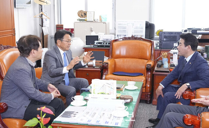 | ▲ 강기정 광주광역시장이 17일 국회에서 박정 예결위원장을 만나 광주시 AI사업에 대해 설명하고, 이번 추경에서 AI예산을 반영해줄 것을 요청하고 있다. /광주광역시 제공 |