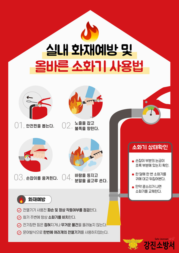 | ▲ 실내 화재 예방 및 올바른 소화기 사용법 안내 포스터 / 강진소방서 제공 |