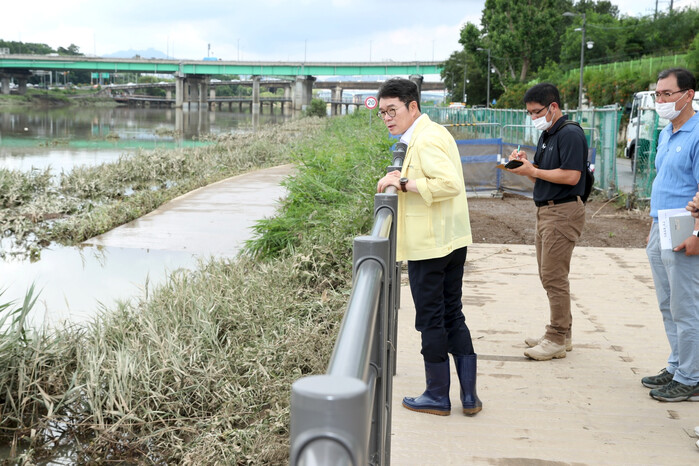 | ▲ 집중호우 시 중랑천을 순찰하고 있는 정원오 구청장 모습. (사진=성동구청 제공) |