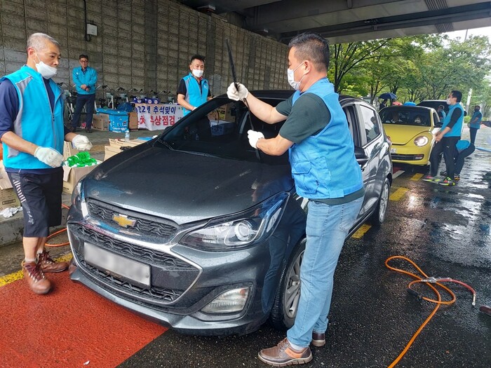 | ▲ 2022년 추석을 맞아 전문 정비요원이 구민의 자동차를 무상점검하고 오래된 와이퍼를 교체하고 있다. (사진=마포구청 제공) |