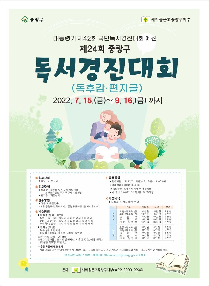 대회는 새마을문고 중랑구지부가 주관, 중랑구가 후원하며 모집 부문은 초등 저학년 및 고학년부, 중등부, 고등부, 대학·일반부로 총 5부문이다. 각 부문별로 독후감이나 편지글 형식의 작품을 제출하면 된다.