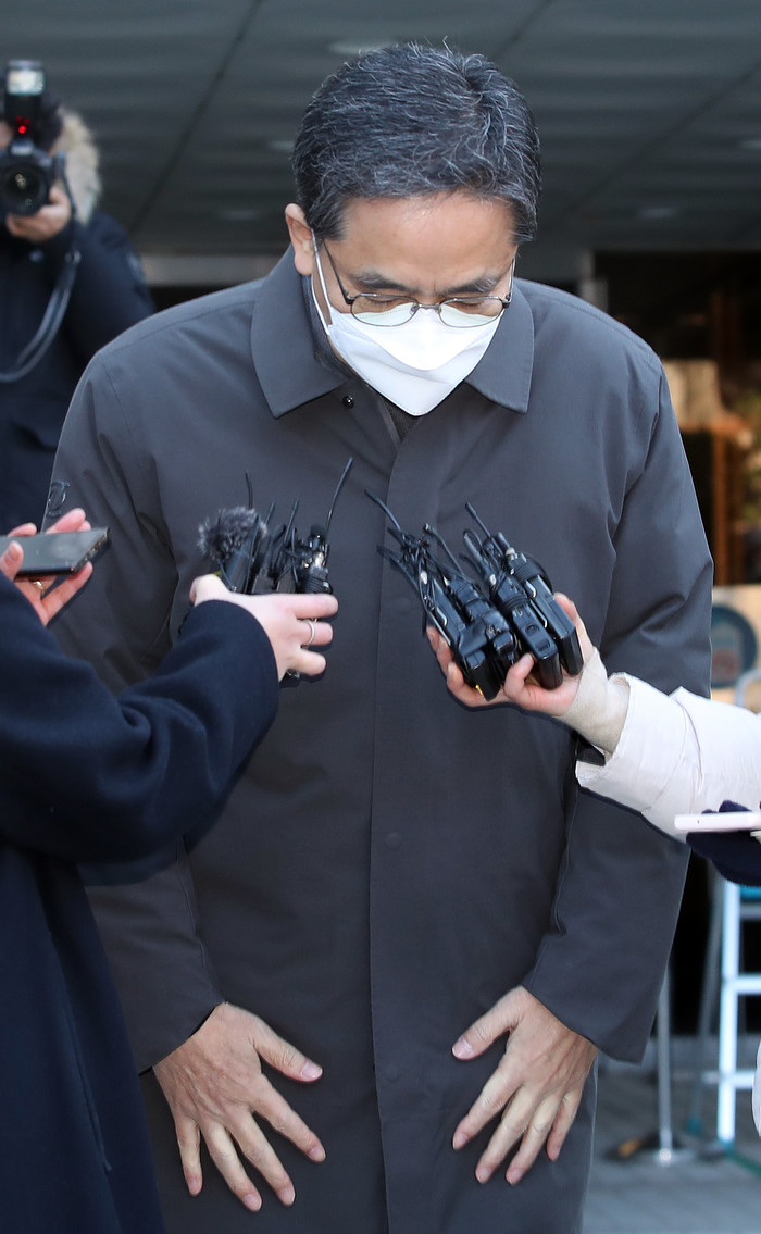 | ▲ 대장동 개발업자들에게 도움을 주고 아들을 통해 50억원의 금품을 받았다는 의혹이 제기된 곽상도 전 국민의힘 의원이 1일 오전 서울 서초구 서울중앙지법에서 열린 구속 전 피의자 심문(영장실질심사)에 출석한 뒤 법정을 나서며 고개를 숙이고 있다. (사진제공=연합뉴스) |