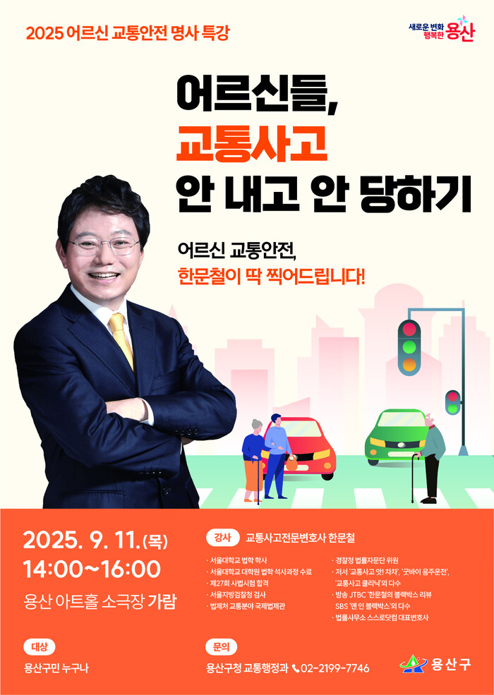[시민일보 = 문민호 기자] 서울 용산구(구청장 박희영)는 오는 11일 오후 2시 용산아트홀 가람에서 '어르신 교통안전, 한문철이 딱 찍어드립니다!'라는 주제로 명사 특강을 개최한다.