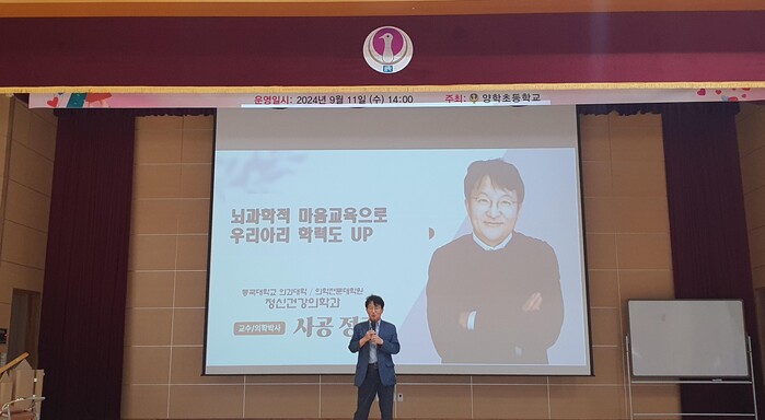 [시민일보 = 전용혁 기자] '힐링닥터'라는 닉네임으로 잘 알려진 사공정규 동국의대 정신건강의학과 교수가 지난 11일 포항양학초등학교 강당에서 개최된 '2024년도 2학기 학부모ㆍ교직원 대상 마음챙김 프로그램'에 초청돼 '뇌과학적 마음교육으로 우리 아이 학력도 UP'이라는 주제로 강연을 했다.