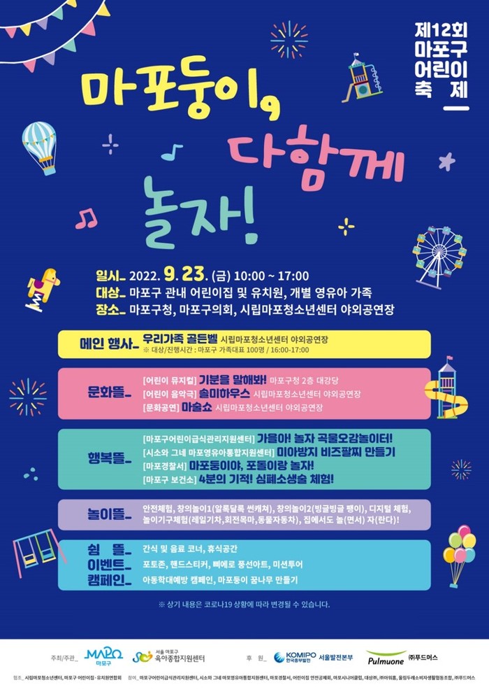 올해로 12회째를 맞은 이번 축제는 오전 10시부터 오후 5시까지 마포구청, 마포구의회, 시립마포청소년센터 야외 공연장 등에서 개최된다.