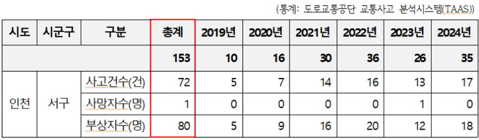 서지영 의원(서구의회 환경경제안전위원회 위원장)이 서구청으로부터 받은 자료에 따르면 연도별 전동 킥보드 관련 교통사고 발생 건수는 2022년 36건, 2023년 26건, 2024년에는 35건이다. 민원 접수 건수는 2022년 69건, 2023년 104건, 2024년 130건, 2025년(10월 기준)에는 무려 208건으로 파악됐다.