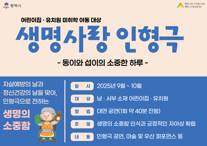 ‘동이와 섭이의 소중한 하루’라는 제목으로 운영되는 이번 인형극은 생명의 ‘소중함 인식 및 긍정적인 자아상 확립’을 주제로 평택시 남서부 지역 어린이집과 유치원 11개소를 순회하며 진행된다. 당초 5회로 계획되었으나, 높은 관심과 신청이 잇따르면서 회차를 확대해 더 많은 아동이 참여할 수 있도록 했다.