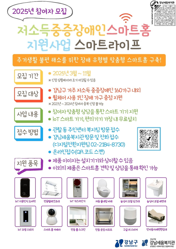 [시민일보 = 여영준 기자] 강남구(구청장 조성명)가 중증장애인을 위한 AI(인공지능)·IoT(사물인터넷) 기반의 스마트 홈 주거환경 개선 지원사업 참여자를 모집한다고 23일 밝혔다.