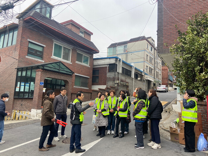 | ▲ ‘골목지킴이’ 대상 근무 요령 및 안전교육을 실시하고, 현장 교육을 진행하는 모습. (사진=성동구청 제공) |